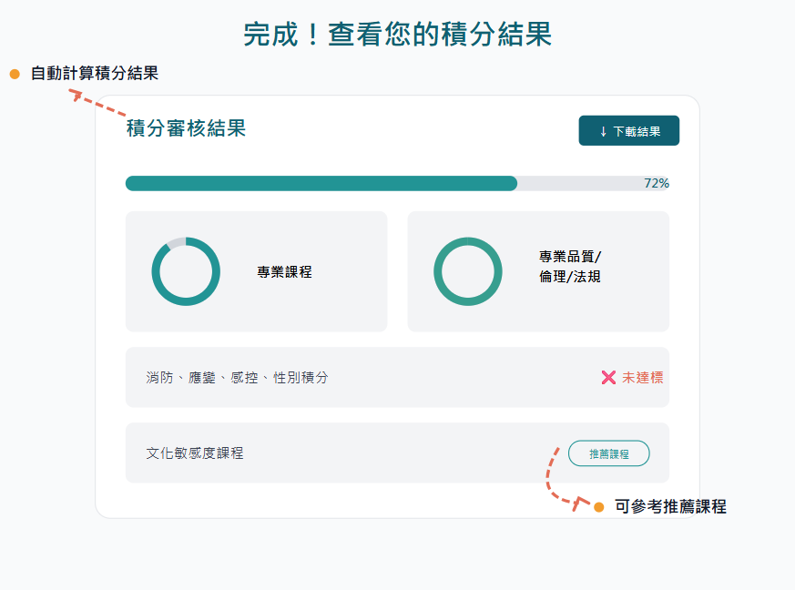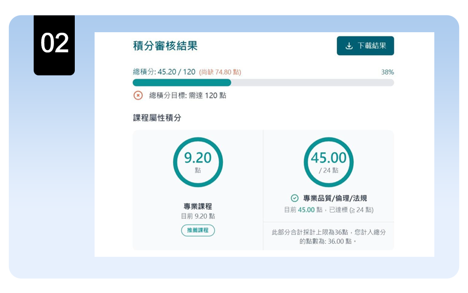 | 系統自動區分各類別、屬性積分。告別手算錯誤,證照展延不卡關。 |