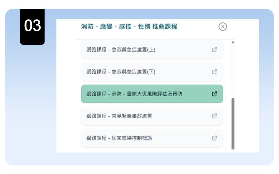 - 特定必修項目:包含消防安全、緊急應變、感染管制及性別敏感度,上述四項合計至少需修習 10 點。