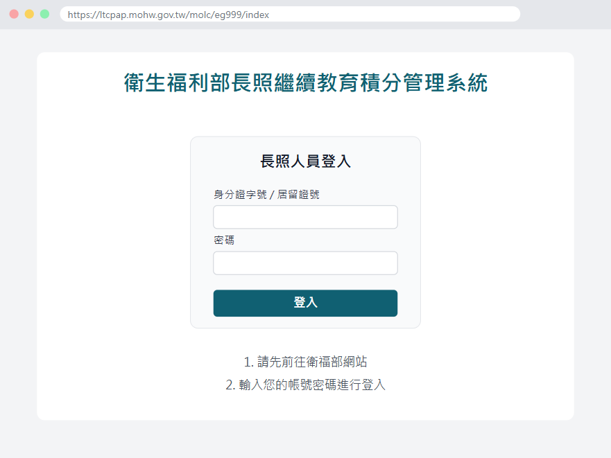 - 長照人員可以登入衛生福利部建置的「長照人員相關管理資訊系統」確認個人積分紀錄。