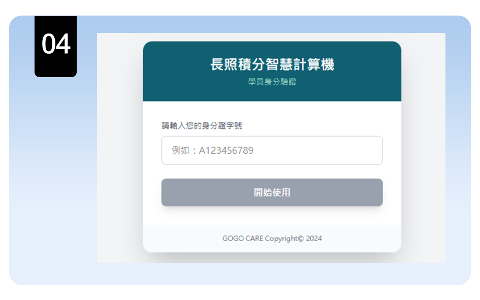 - 輸入身分證字號進入 GOGOCare 長照積分計算機